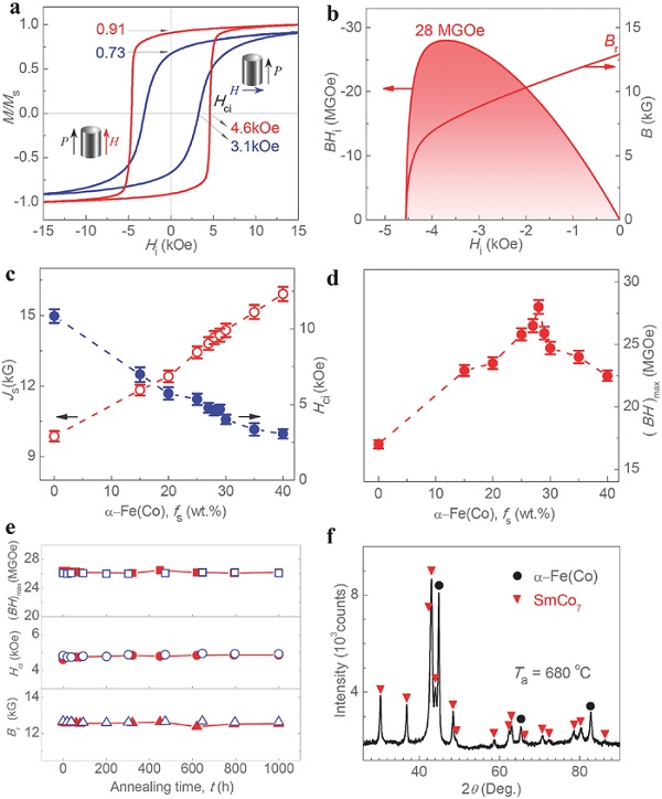a)所制备的块体各向异性纳米复合永磁体的磁能积与相关材料的磁能积的比较;b)纳米复合永磁中的软磁相和硬磁相的协同作用及纳米复合永磁体微观结构形态与性能的关系。