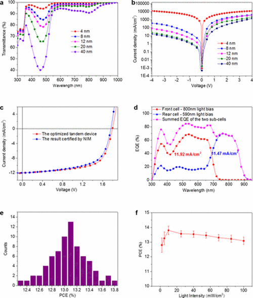 研究者们通过完全优化两电池和ICL的活性层制备得到高度有效地无富勒烯串联有机太阳能电池,设计WBG前半电池、新型SM NF隔膜、ITCC-M用于实现窄吸附谱,具有高的Voc;通过优化NBG后半电池、阳极缓冲层和活性层的相分离形态可以在近红外区域实现高EQE。通过使用优化厚度的ICL实现电荷收集和复合还有高透光系数,制备得到的串联电池的PCEs在0.02-1sun的光照下可达13%-14%。总体来说,文章中的工作不仅证实了系统的工作可以实现优异的光电结果,还显示出无富勒烯串联有机太阳能电池的超高性能。但是由于最优器件的全部EQE仍不是很高,填充因子FF也只有0.639,因此在其光电性能上未来还有很大地提升空间。