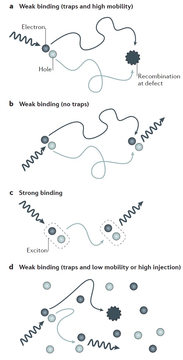 迁移率是衡量电荷载流子在电场存在条件下运动通过传导介质时速度的物理量。激子结合能是衡量电子和空穴间相互作用强度的物理量。这些参数对于半导体的电学特性是十分重要的,并且通过影响载流子的复合直接影响光电器件的效率。半导体材料中的三种主要复合形式为:缺陷处的非辐射复合、辐射复合和非辐射俄歇复合。