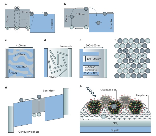 为了发展高效率的液相处理光伏器件,其中很重要的一点就是增加载流子的扩散长度,而这由高密度缺陷或高辐射损失所限制。在有机半导体中,由于电子和空穴间的强烈相互作用,损失是由辐射复合所决定,这就会导致十分稳定的激子。在量子点和钙钛矿中,激子会轻易地分离出自由载流子,而当其遇到缺陷位点时就会发生复合。因此,减少缺陷密度就成为了液相处理材料研究中的普遍主题。有机材料中的块体异质结(BHJs)能够促进界面中光生激子的快速电荷分离,因此阻止了双倍的(郎之万)复合,从而能够使得电子和空穴通过分离的相进行传输。同样重要的是每一个相都能够连续确保载流子畅通无阻地到达电极。BHJ的策略是实现有机太阳能电池成功的关键,现今认证效率已经超过了12%。其同样可应用于其他载流子扩散长度较短的系统中,如无机纳米晶以及混合聚合物-纳米晶器件。