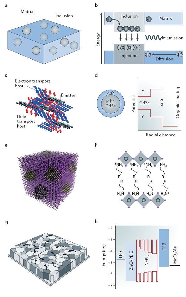 液相处理半导体器件中正在逐渐使用异质结构,即将两种或两种以上具有不同能级范围的材料整合在一个复合系统中的方法。异质结构材料能够提供额外的自由度来更有效地控制光电子器件中的电荷输运和复合。通过应用能级的非对称性,理性调控的异质结构材料能够克服缺点、增加优势并能引入单材料系统所无法达到的物理现象。异质结构系统在电荷载流子调控两个明确的分支中获益并应用:第一,它们会影响激子和自由电荷间的平衡,并在太阳能电池和光探测器中增强电子的分离;第二,通过空间限制的电子和空穴,它们能够促进辐射复合,增强发光二极管的量子效率。
