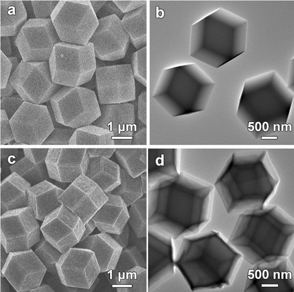 ab)Zn/Co正十二面体,cd)双壳层Zn/Co-ZIF 正十二面体笼。