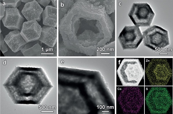 双壳层Zn-Co-S正十二面体笼的a,b)高分辨扫描电镜照片和c-e)透射电镜照片。
