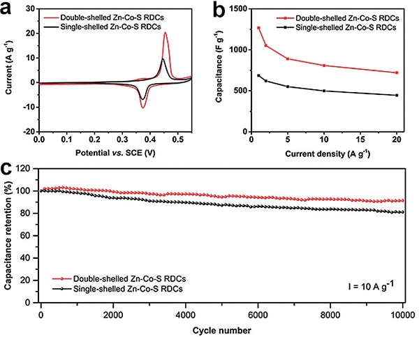 课题组利用连续化学腐蚀和硫化的方法制备了结构完整的双壳层中空结构的锌-钴硫化物正十二面体。这一结构相对于单层结构,循环的比容量和稳定性都有很大的提高,为构建中空结构材料应用在储能方面起到有效地推动作用。