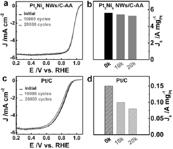 b、d) Pt3Ni6 NWs/C-AA、Pt/C经过不同循环周期前后的质量活度。