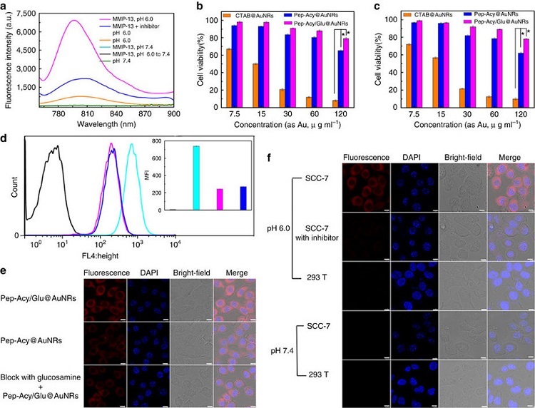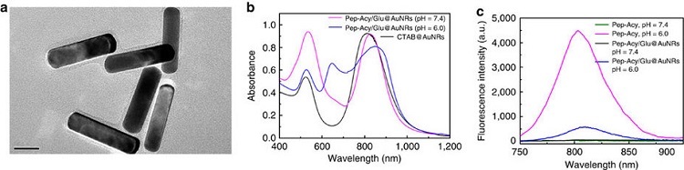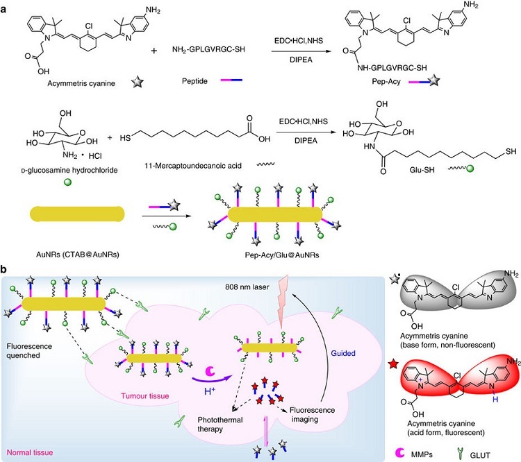 (b) 探针Pep-Acy/Glu@AuNRs对MMPs和PH的协同响应在活体中诊疗方式:探针进入正常组织处不发光,在患处(GLUT)由于PH响应,Cy释放(MMPs)在808激发下发光(酸性)成像,同时金纳米棒也这种导向下进行光热治疗。