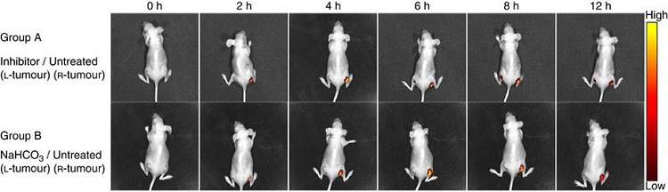 A组左侧肿瘤为提前通过MMPs抑制剂处理,右侧为未加处理的肿瘤患处,抑制条件下6h后荧光信号出现