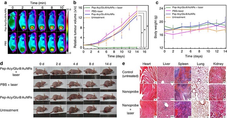 (a) 治疗组(注射药物Pep-Acy/Glu@AuNRs)和对照组(仅注射PBS缓冲液) 小鼠在808辐照4h后肿瘤部位的热成像