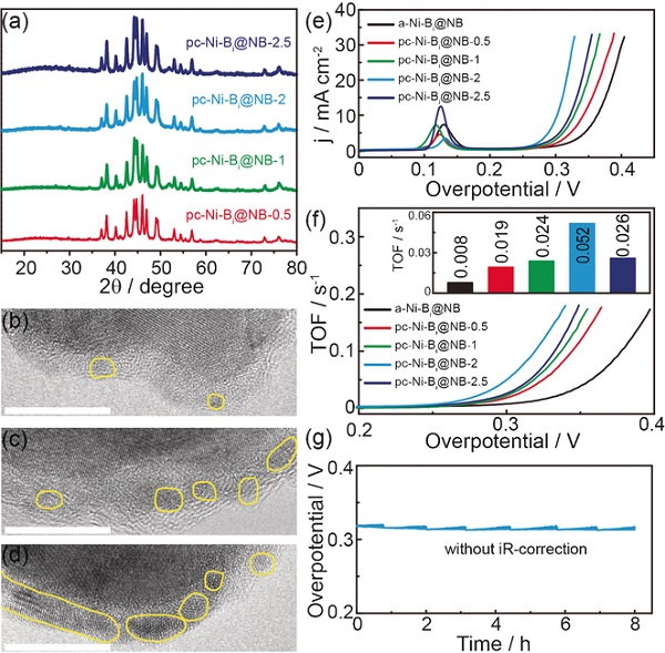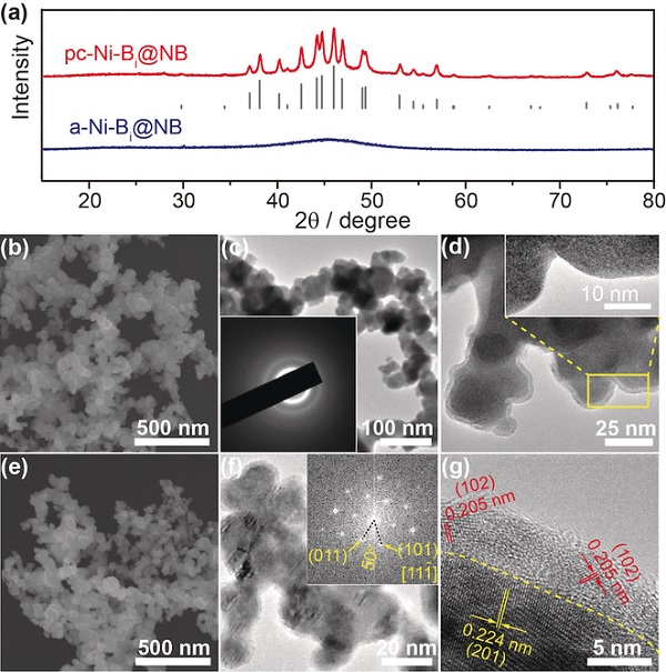 (e-g) 部分结晶Ni(BO3)2包覆Ni3B纳米颗粒(pc-Ni-Bi@NB)的TEM图。