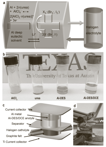 近日,来自苏州大学的赵宇教授和德克萨斯大学奥斯汀分校的余桂华教授(共同通讯)等人研制出了一种铝基易溶溶剂用作氧化还原液电池的阳极电解液。铝基易溶溶剂在阳极电解液中显示出显着增强了约3.2M的浓度,并且相对于Li–/Li低2.2V的氧化还原电位。电化学测量表明,当与I3–/I–阴极电解液耦合时,已经实现了145 Ah L-1的可逆容积和189 Wh L-1或165 Wh kg-1的能量密度。