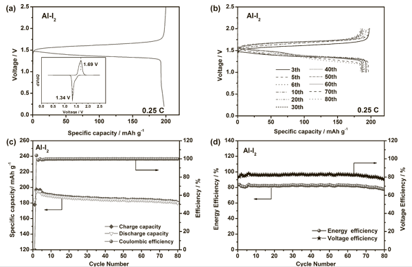 b-d)在测量的80个循环中,典型的放电/充电曲线,容量和库仑效率以及Al-I2 RFB的能量/电压效率