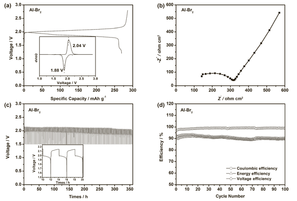 a)使用Al-DES/DCE作为阳极电解液, 0.3M LiBr和1M KBr作为水性阴极电解液在0.1mA cm-2条件下的Al-Br2 RFB的代表性放电/充电曲线