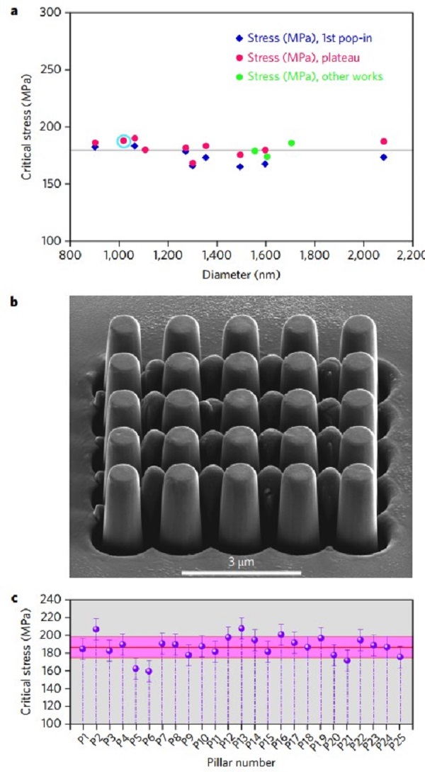 图二 微米尺寸微柱的超弹性临界应力及纳米压缩实验的可重复性