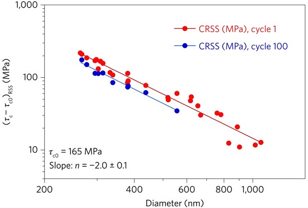 临界分切应变的尺寸依赖性:红点对应图四(a)所表示的第一个循环;蓝点对应图4b所表示的第100个循环。