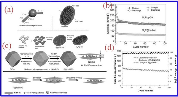 图 1 磷基合金类负极材料设计与制备:(a )3D 核壳结构多孔石墨烯包覆磷化镍(Ni 2 P⊂ pGN)制备流程 ;(b)Ni 2 P⊂ pGN 在 在 0.2Ag -1 电流密度下的循环性能;(c )氮掺杂的多孔碳包覆磷(P@N-MPC )负极材料的制备及储钠过程示意图;(d )P@N-MPC 在 在 0.15Ag -1 电流密度下的循环性能。