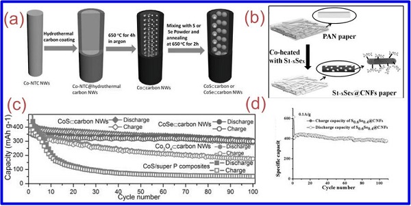 图 2:多孔碳纤维负载过渡金属硫化物:(a)豆荚状 豆荚状 CoS⊂ carbon NWs 、CoSe⊂ carbon NWs 制备示意图 制备示意图 ;(b)CoS⊂ carbon NWs 、CoSe⊂ carbon NWs 在 在 0.1Ag -1 电流密度下的循环性能;(c )S 1-x Se x @CNFs 电极材料的制备;(d )S 1-x Se x @CNFs 在 在 0.1Ag -1 电流密度下的循环性能。