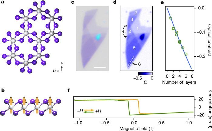 石墨烯的出现,随之而来的二维材料家族不断扩大,它们都展现出很好的电学性质。为了扩宽它的性能,还可以添加一些具有自旋-谷耦合的半导体、可以转变为量子金属的Ising超导体、具电荷密度波可调的Mott绝缘体和可以边缘传输的拓扑半导体等附加物。然而,目前还没有发现具有本征磁性的二维晶体(除了同期刊登的张翔院士研究成果),这种晶体在传感和数据存储方面有着很大的应用前景。理论上,在二维各向同性、特定温度满足Mermin-Wagner定理的Heisenberg模型中,磁性有序是受到限制的。磁各向异性消除了这些限制,使得二维Ising铁磁性能够实现。