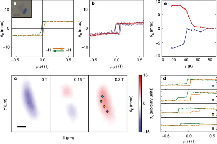 华盛顿大学西雅图分校的许晓栋和麻省理工学院的Pablo Jarillo-Herrero(共同通讯作者)等人利用磁域观测显微镜证实了单层CrI3二维材料为Ising铁磁体,具有面外的自旋取向。居里温度为45K,仅些微的低于块体材料(61K),这与弱的夹层耦合相对应。并且,研究发现受层数影响的磁性相,表明在分子晶体中受厚度影响的物理性质。双层CrI3具有变磁性效应,展现出受抑制的磁性,而三层CrI3中夹层的铁磁性则被修复。这项研究为揭示材料中不同寻常的原子级特性进而研究材料的磁性,如电调控的磁电子学、范德华力引起的界面效应等都提供了研究基础。以上研究成果以“Layer-dependent ferromagnetism in a van der Waals crystal down to the monolayer limit“为题与张翔院士以”Discovery of intrinsic ferromagnetism in two-dimensional van der Waals crystals“为题的研究成果(材料牛资讯详戳 张翔院士Nature重磅: 二维分子晶体本征铁磁性的发现!)一起背靠背刊登在2017年6月8日出版的Nature上。同期,宾夕法尼亚大学的Nitin Samarth教授为该成果撰写了题为“Condensed-matter physics: Magnetism in flatland”的新闻评述(Nature,2017,DOI:10.1038/546216a)。