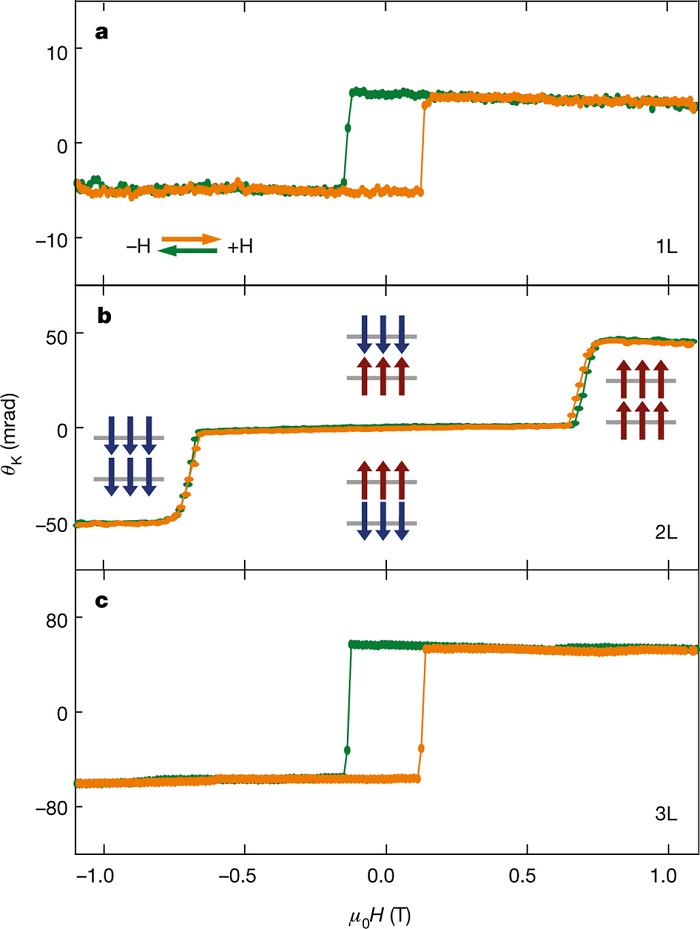 图三、原子级厚CrI3受层数影响的磁有序性