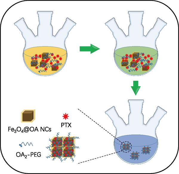 将MNPs用作DDS是MNP的另一个常见用途。MNPs能够将抗癌药物输送到肿瘤细胞中,而不损害健康细胞。与其他纳米药物递送系统(如聚合物纳米粒子、脂质体和胶束)相比,MDDS具有更好的MRI性能,可以监测药物在动物体内的分布。此外,MNPs是可生物降解的,这极大地有益于其生物医学适用性。然而,MNPs作为药物纳米载体的功效通常在纳米颗粒到达靶组织或细胞之前通过RES的组织巨噬细胞的快速调节和随后的血浆清除来抵消。虽然人们已经开发了许多使用药物加载MNPs的方法,但是当需要在目标区域进行大药物释放时,磁性载体可能表现不佳。较小的颗粒可以提供更大的表面积,因此更适合于药物负载,但这是以降低磁特性为代价的。为了解决这个问题,Xiong等人组合了四种独立的油酸封端的氧化铁纳米管和油酸改性的PEG分子,形成团簇。这些纳米磁性簇保持了高紫杉醇(PTX)药物负载、高磁性、快速和延长的释放行为。