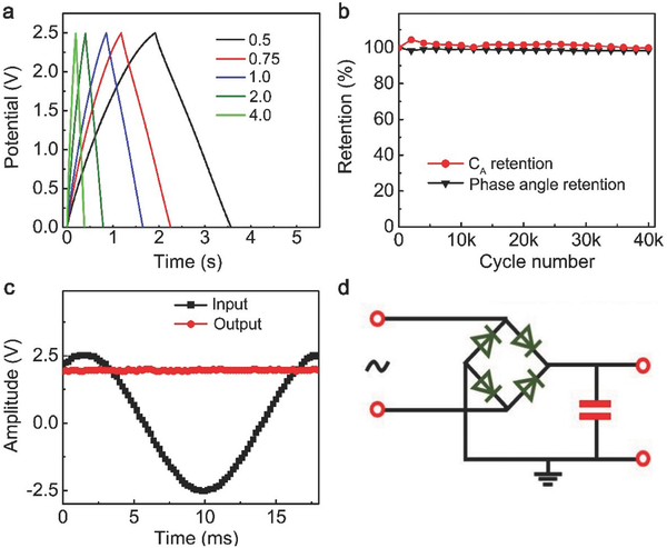 研究者们通过电化学还原sLGO膜作为电极材料在有机电解质中经过进一步深刻的电化学还原成功制备石墨烯基超快有机电化学电容器。这些DRsLGO膜具有高度导向多孔微观结构与高导电性而且对有机电解液具有良好的润湿性,因此,电极的表面电解液完全可达,电解液中的离子很容易能够扩散到电极形成双电层中而且电子通过高导电石墨烯框架能迅速转移。典型OEC-4显示出高的面积比电容,超快的倍率性能和良好的电化学稳定性,适用于AC线路滤波器。此外,OEC的电压窗口可扩展到3 V,提供更大的能量密度。几个OEC-4电池可以通过串联或并联获得理想的电容或电压用于实际应用中。