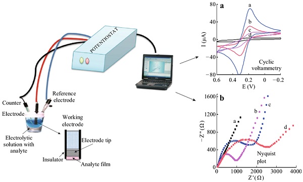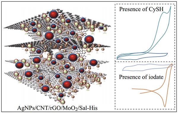 通常的电催化剂只具有单一的电催化氧化或还原特性,同时具有电催化氧化和还原活性的电催化剂的研发还存在挑战。本文用简单的一步法合成了 AgNPs/CNT/rGO纳米复合材料,成功制备了一种双功能阻抗传感器电极。这种电极可以同时实现半光氨酸(CySH)的电催化氧化和碘酸盐的电化学还原。通过检测界面电荷转移电阻(Rct)的变化,可实现对CySH和碘酸盐的同时高灵敏度监测。