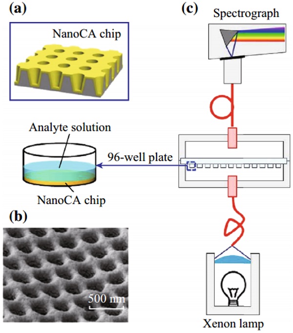 本文研发了一种新型多肽修饰的纳米等离子传感器,用于监测TNT爆炸物。主要方法是先利用纳米压印制备了纳米杯阵列,再通过沉积金纳米颗粒使表面具有局域等离子体共振特性,最后利用Au-S共价键修饰,将具有特定TNT序列的多肽固定在纳米器件表面。所制备的纳米等离子传感器可有效用于爆炸物2,4,6-TNT的监测,检测浓度低至3.12 × 10−7 mg/mL。