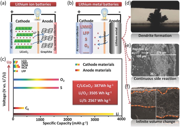 c)典型电极材料在电压和容量方面的比较,LMBs的能量密度远大于LIBs;