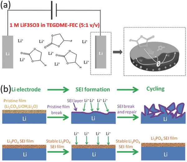 a)在Li-O2电池组装之前,在含有1 M LiF3SO3的TEGDME-FEC(5:1 v/v)电解质中,锂负极上保护膜的电化学形成;