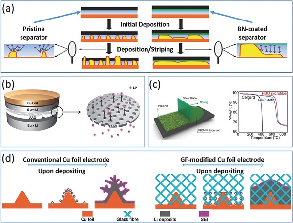 常规的非织造聚合物或微孔隔膜太脆弱以至于不能抵抗枝晶,对锂沉积行为没有显著影响。这里开发了改进的中间层,以进一步保证电池的性能,这主要是通过与枝晶或锂离子通量的相互作用。这里,中间层具有不同的功能,包括专门设计的分离器或附加的保护层,以弥补分离器的弱点。