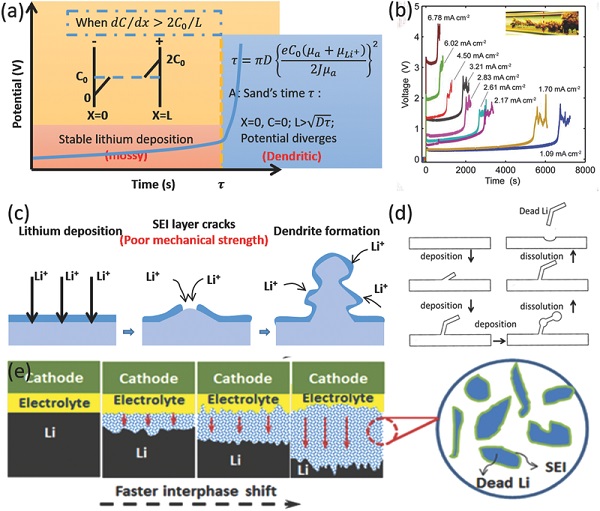 LMBs中锂离子的行为与LIBs中锂离子的插入/脱嵌行为完全不同。通常,在充电期间,锂离子从外部电路获得电子,然后以金属-锂颗粒的形式直接沉积在负极表面或下方。如果不对体系进行任何修饰,就会在锂负极的顶部形成枝晶状图案。为了揭示锂沉积行为、负极形态和界面的演变,各研究小组通过计算或高级表征技术从不同方面提出了相关模型。