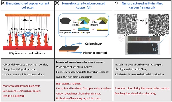 锂粉末和表面改性的锂箔可以作为平面锂箔的替代物,以延迟枝晶的产生。负极的表面积大大增加以提供相当大的沉积位置,从而在一段时间内抑制枝晶生长。然而,锂箔的表面状态和粉末之间的边界不会持续很长时间,并且整个箔在长时间循环中会变成随机分散的锂微结构的聚集体。相比之下,集流体(CCs)方法取得了较好的表现,传统铜箔被纳米结构化的材料代替。之后为了避免纳米结构铜的缺点,开发了碳涂覆的铜箔,这些碳涂层都贡献了更好的电化学性能,这与其优异的导电性、高比表面积和合适的孔径/体积比具有密切的关系。与纳米结构或碳涂层铜箔相比,自支撑碳膜本身可直接作为CCs,能够避免有机粘合剂或碳脱落产生的导电性所带来的不利影响。