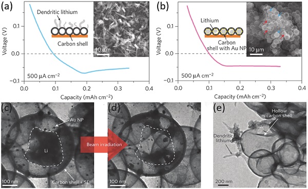 c-e)锂沉积(c)、原位电子束加热(d)后具有Au NPs的纳米胶囊,锂沉积后没有Au NPs的碳壳(e)的TEM图像。