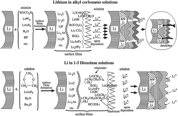 通常,本征SEI层由各种有机物(低聚物和聚合物)和无机物组成,其中有机部分赋予SEI层柔性以适应锂沉积,而无机部分能够实现快速的锂离子传输。然而,无机碳酸锂(Li2CO3)和锂乙烯碳酸氢钠(LEDC)作为两个主要的SEI组分,在锂沉积电位附近是热力学不稳定的,并且允许循环中反应发生,而氧化锂(Li2O)是唯一的热力学和动力学稳定的组分,最里面的SEI层中的Li2O薄层是非常重要的,以避免在没有氟化物源的情况下破裂。此外,化学和物理各向异性在SEI层内是常见的,同时导致异质锂通量和不均匀沉积。沉积和溶解时,由无机离子香料组成的表面不能适应形态变化,因此可能会分解,导致高度不均匀的锂沉积,使得枝晶形成。迄今为止,选择合适的溶剂、锂盐和添加剂可以有效和高效地调节SEI层的性质。