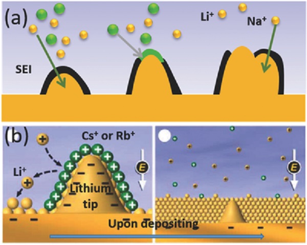 b)自愈式静电屏蔽机制。Cs+或Rb+将积聚在尖端附近以形成静电屏蔽,排斥Li+沉积在负极附近区域。