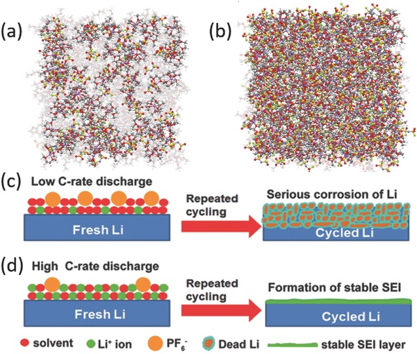 c-d)低速率高速率放电时,锂金属负极上的SEI演变。