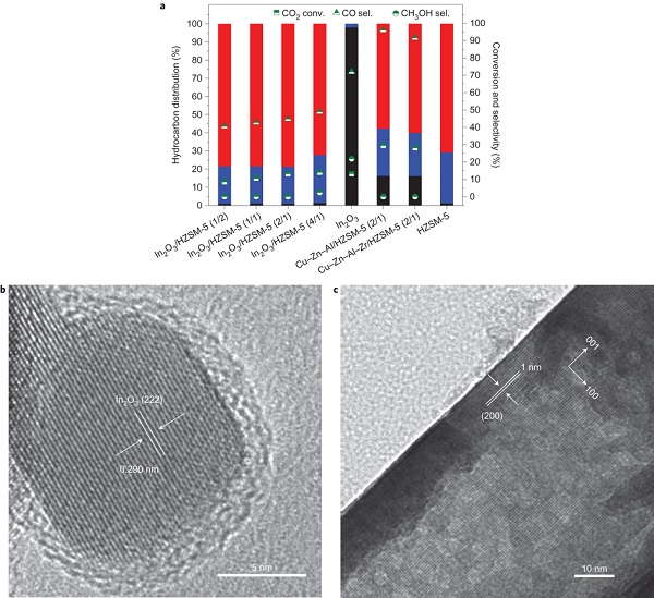 近日,中国科学院上海高等研究院低碳转化科学与工程重点实验室暨上海高研院-上海HTH官网地址 大学低碳能源联合实验室在二氧化碳(CO2)利用领域取得重要进展,创造性地采用氧化铟/分子筛(In2O3/HZSM-5)双功能催化剂,实现了CO2加氢一步转化高选择性得到液体燃料。其中,中科院上海微系统与信息技术研究所参与了部分工作。该研究成果于6月12日在Nature Chemistry杂志上以题为“Direct conversion of CO2 into liquid fuels with high selectivity over a bifunctional catalyst”在线发表,并已申报中国发明专利和国际PCT专利。此项研究工作得到了自然科学基金委、科学技术部、上海市科委和中科院的大力支持。