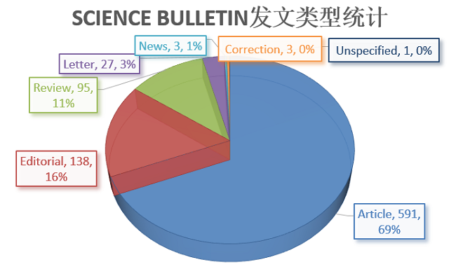 从发文类型来看,Science Bulletin以研究论文(Article)为主,达到总发文量七成;同时还发表综述(Review)、进展(Progress)、通讯(Short Communication)、评论(Commentary)、研究亮点(Research Highlight)和新闻与视点(News & Views)等类型文章。