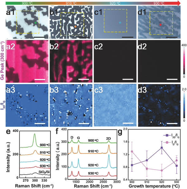 e)在不同温度下石墨烯生长300分钟后的Ge的拉曼光谱
