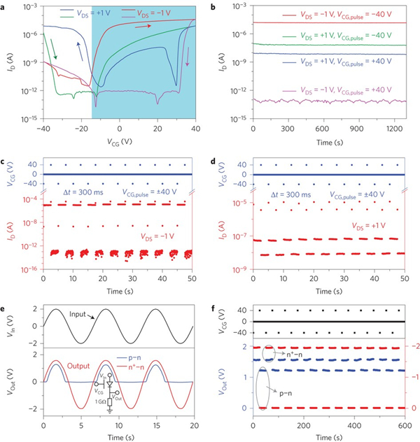 图3. WSe2/h-BP/graphene 异质结构实现非易失性p-n结存储器和逻辑整流器