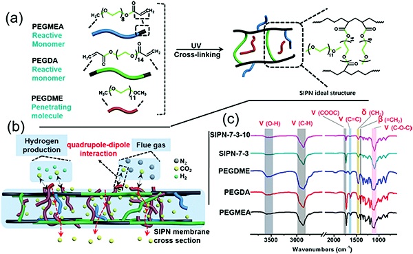 图1. SIPN 膜的结构,气体分离示意,FT-IR表征
