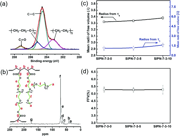 图2. SIPN膜XPS,13CNMR谱图及free volume radii和fractional free volume表征