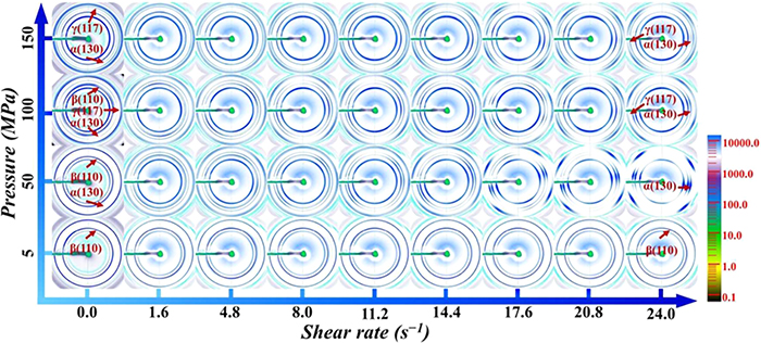 (c) 压力为100 MPa的条件下,随着剪切率增大,β(110)晶体衍射峰急剧降低;