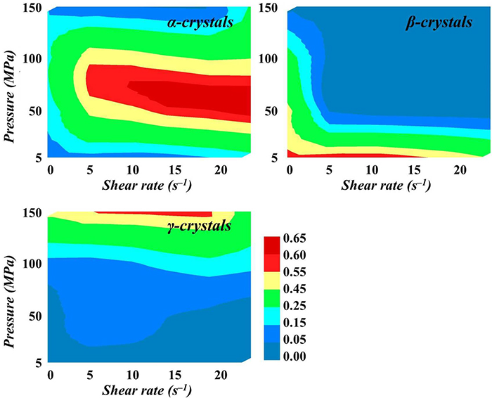 图4 不同剪切率和压力下,iPP和β-NA混合物的结晶度示意图