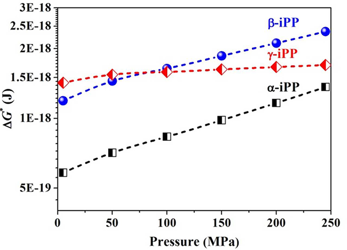 随着压力的增加,α、β、γ 三种晶体在形成过程中计算得到的成核自由能也逐渐增加。