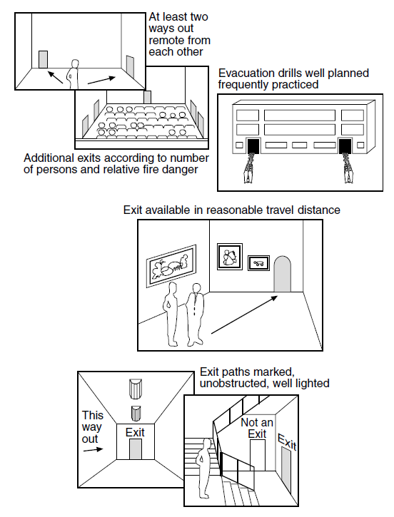 1. 足够数量妥善设计的畅通的逃生手段,有足够的容量和安排。