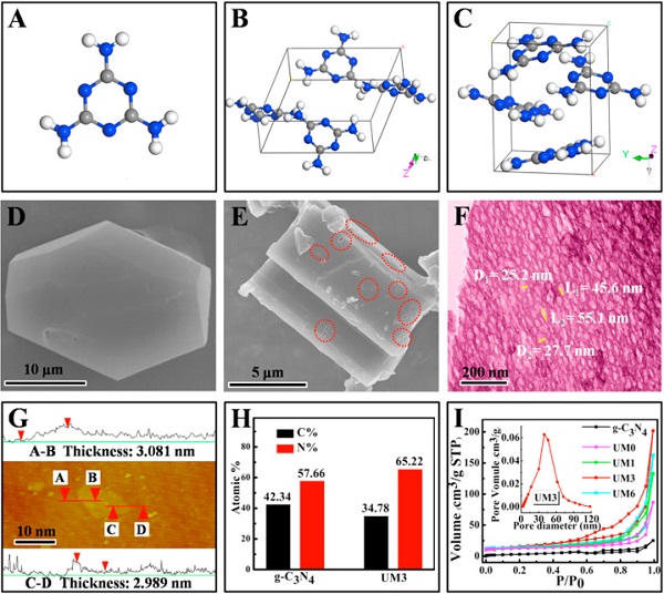 A) 三维多孔超薄结构N掺杂g-C3N4的合成示意图;