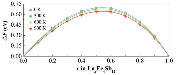 不同温度下LaxFe4Sb12的自由能随其中La的含量的变化。