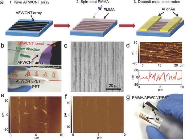 (d)铺在PET上的AFWCNT阵列的表面特征的地形AFM图像;