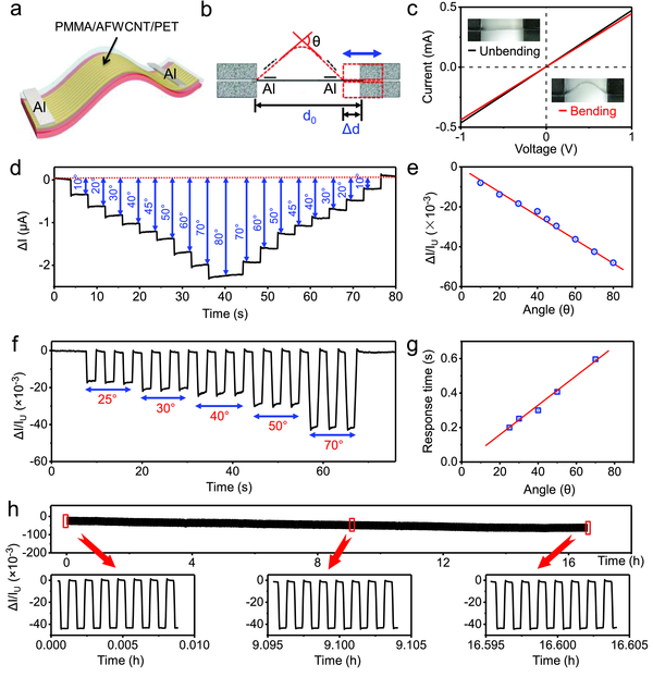 (g)屈曲敏感的E皮肤从非弯曲状态到不同弯曲状态的响应时间(f);中空矩形表示实际响应时间,红线表示线性拟合数据;
